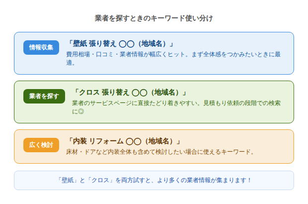 業者のウェブサイトやポータルサイトでは「クロス工事」「クロス張り替え」といった表現が多く使われているため、検索でヒットする件数が増えます。