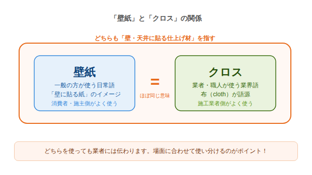 一方「クロス」は、布(クロス=cloth)を語源とする業界用語で、職人や施工業者がよく使う表現です。