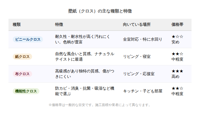 壁紙(クロス)には素材によっていくつかの種類があります。