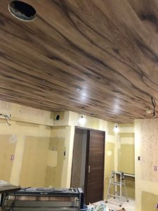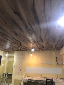 施主様のご希望に合わせて、お店の雰囲気と合うように天井は木目調、そして壁はコンクリート調のクロスを使用して施工しました。